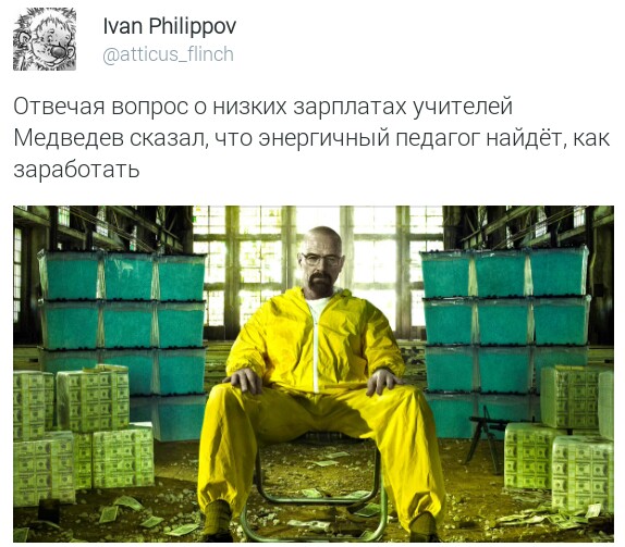 Медведев полагает, что энергичный учитель найдет возможность заработать дополнительные деньги. Главное, сказал председатель Правительства РФ, тут личный выбор — если вы работаете педагогом, то значит это ваше призвание. А быстрее заработать деньги можно в других сферах, например, в бизнесе.