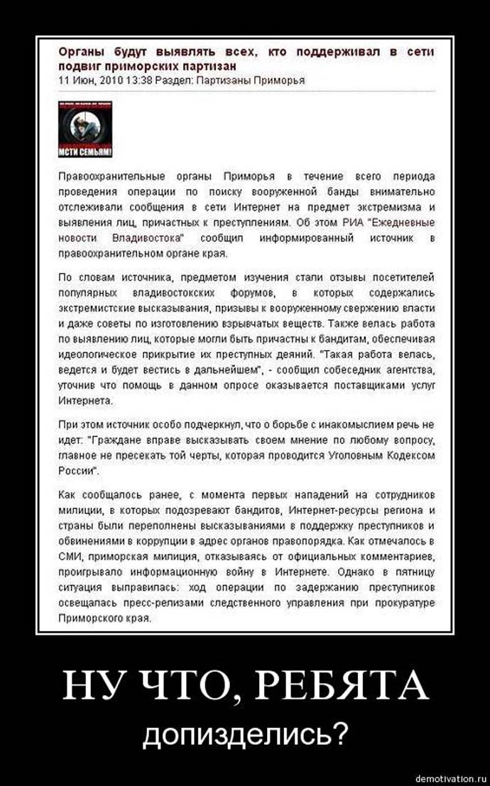 Я все-таки думаю не загребут пока. Сейчас представители власти, а тем более представители силовых структур чувствуют себя достаточно свободно и безнаказанно, и то что где-то, кто-то, кого-то, почему-то нехорошими словами называет, их не очень трогает. Собака лает караван идет. Это такая форма цинизма дрочить или в лучшем случае не замечать, считая быдлом тех, кто платит тебе деньги (я имею в виду налогоплательщиков). Сейчас вся эта околовластная прикентовка достаточно твердо стоит на ногах. Репрессии начнутся когда у них земля из под ног начнет уходить, и я не исключаю, что такие времена могут наступить.