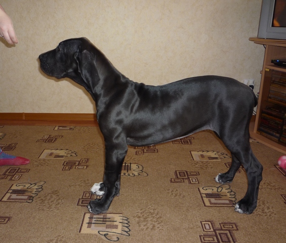 Главное что лапки ровненькие! Кондиция отличная (не пытайтесь "откормить" её) ... Шея красивая... голова... всё при ней! А дальше... научите и голову держать гордо вверх и спинка со временем выровняется и грудка раздастся! А пока, для Дога (растущего "по зап. частям" ))) отлично всё смотрится!