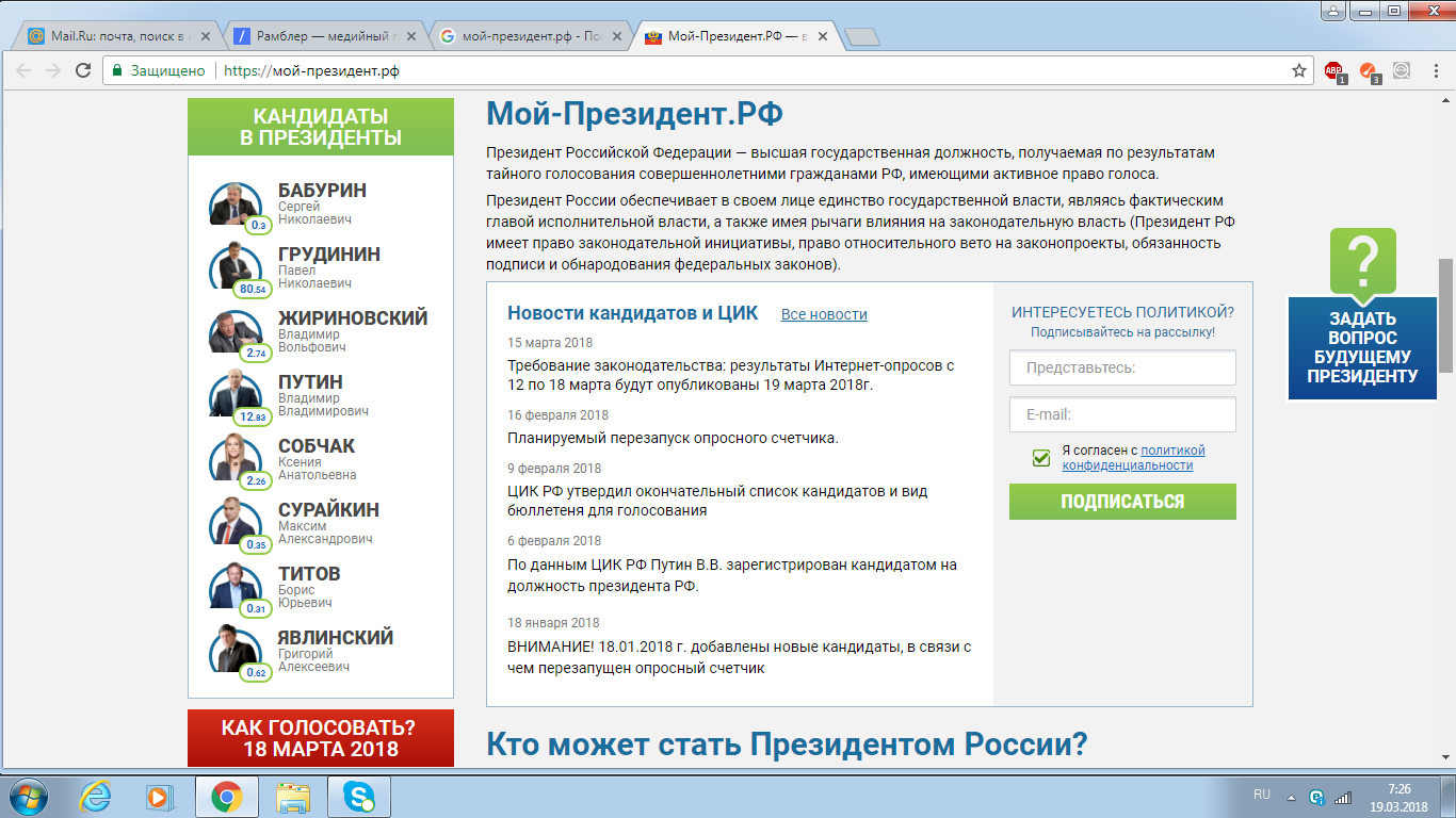 Согласно лживым подсчетам голосов ЦИК РФ, о том, что Путин В.В. якобы лидирует с 75,5% на выборах 18 марта 2018 года, можно сделать единственно правильный вывод: результаты выборов 18 марта 2018 года однозначно фальсифицированы с самого начала! А вот и данные независимого опроса, за кого люди намерены были голосовать, соответственно, голосовали в реальности!