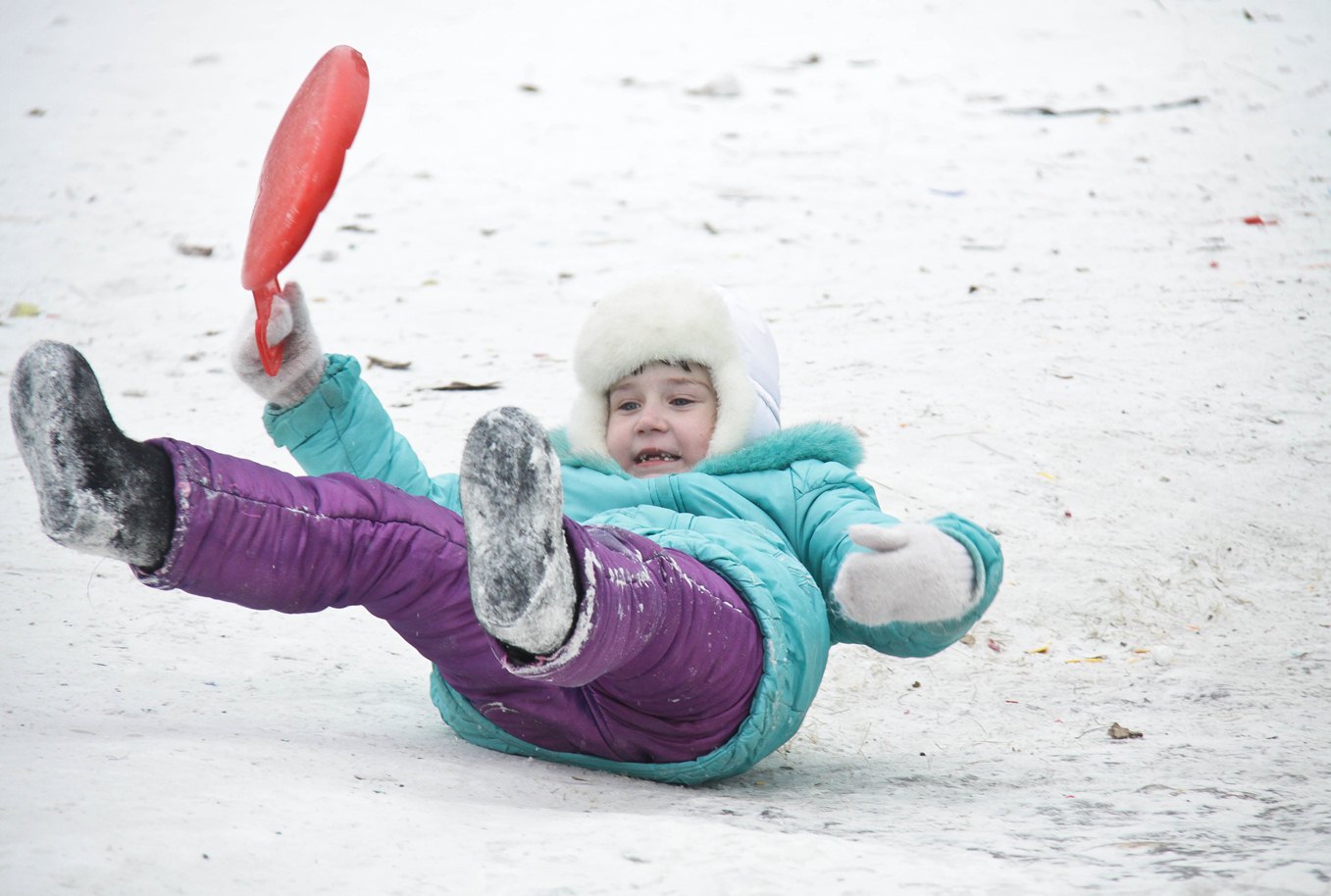 Лихо на санках съезжает Егорка.