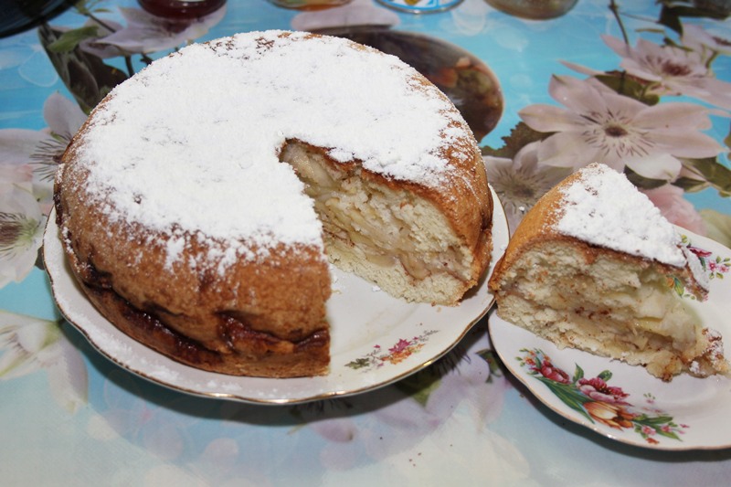 Потом еще минут 5-10 дала постоять, не открывая. Затем перевернула готовую шарлотку на тарелку и посыпала сах.пудрой.