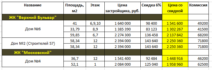 В рамках предложения "Выгода пополам" представляю список квартир со скидкой в жилых комплексах "Верхний Бульвар" (Ленинский район) и "Московский проспект" (Центральный район). Звоните, +7-905-905-0207 Евгения