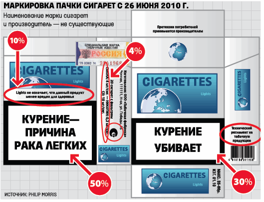 ...Еще не менее 50% площади обратной стороны упаковки должна занимать одна из 12 утвержденных Минздравсоцразвития надписей о последствиях курения. Например, «Курение может вызывать бесплодие»; «Курение может стать причиной медленной и болезненной смерти»; «Курение может являться причиной импотенции».