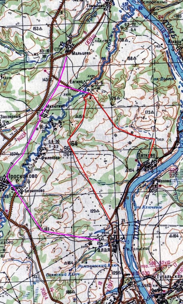а розовый это та дорога по каторой в царские времена до асфальтной трассы была дорога до томска, плохо что в Филоново она не заходит, там места покупаться классные говорят есть.