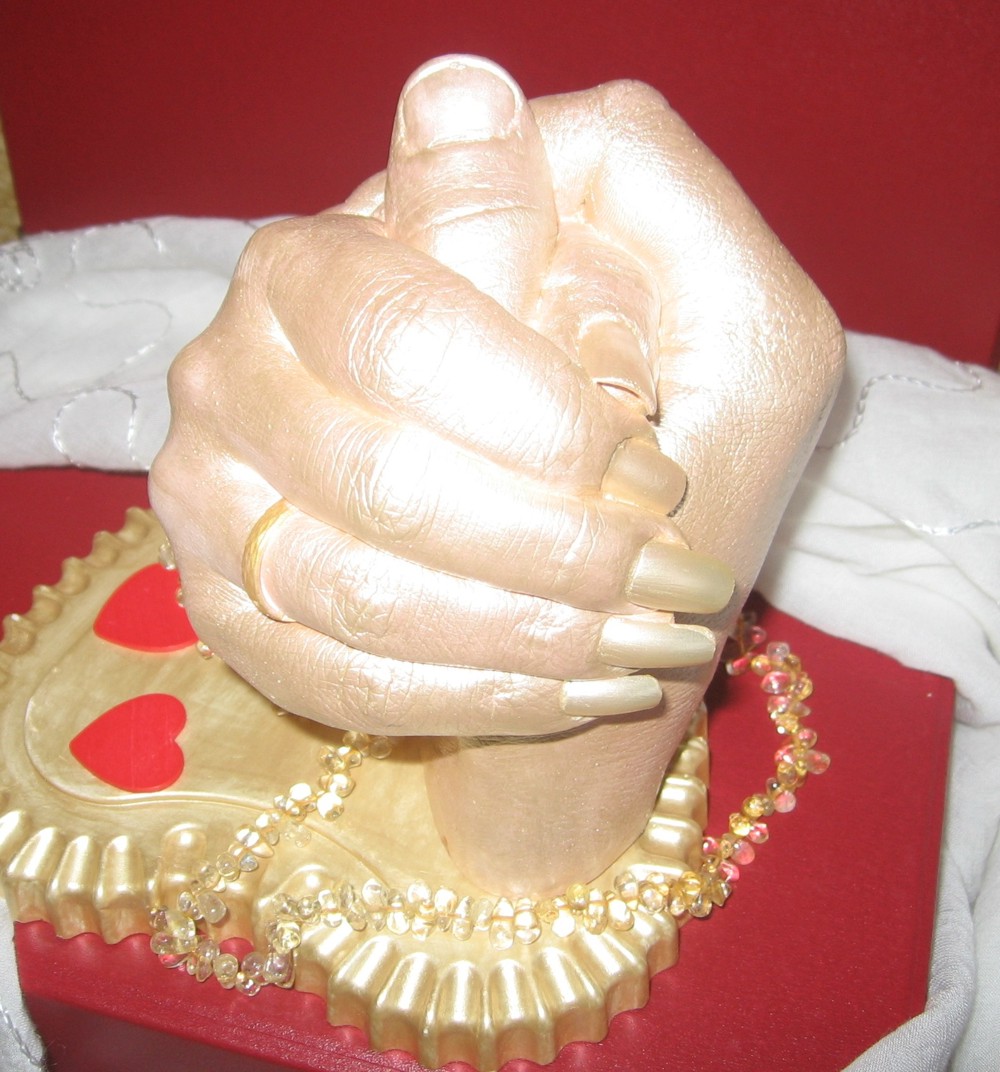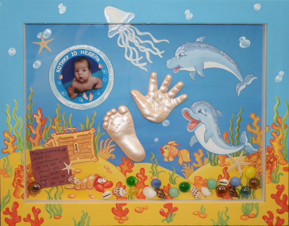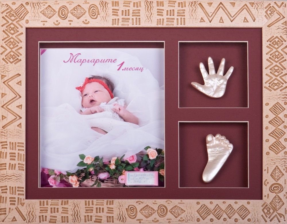 точные копии ручек и ножек малышей и рук влюбленных в красивой багетной рамке или в виде скульптуры на подставке.