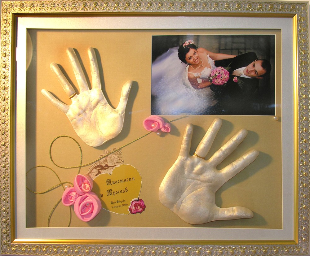 точные копии ручек и ножек малышей и рук влюбленных в красивой багетной рамке или в виде скульптуры на подставке.