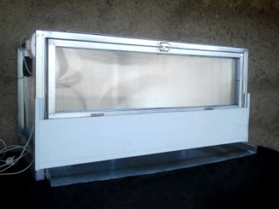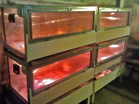 Изготовили брудер. Т. к. помещение у нас теплое, делали из поликарбоната. Размер одного 100х50х50 см. Батарея 4 брудера.