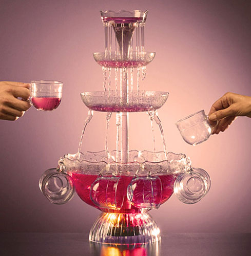 Фонтан для напитковФонтан легко превратит процесс распития напитков в увлекательное занятие. Функционирует он точно так же, как и водяной фонтан, только вместо воды льется любой напиток — гости будут подходить и просто подставлять свои бокалы под ароматные струи. Работает такой фонтан самостоятельно на протяжении всего мероприятия, нужно только не забывать подливать напитки.