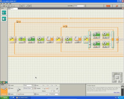 Я запрограммировал робота в бесконечный цикл движения с объездом препятствий, получилось довольно интересно, робот как будто живой - мотает головой с сонаром - ищет где можно проехать, поворачивает туда, короче в плане программирования творить можно, а в плане аппаратной реализации - лего, это начало - дальше поглядим.