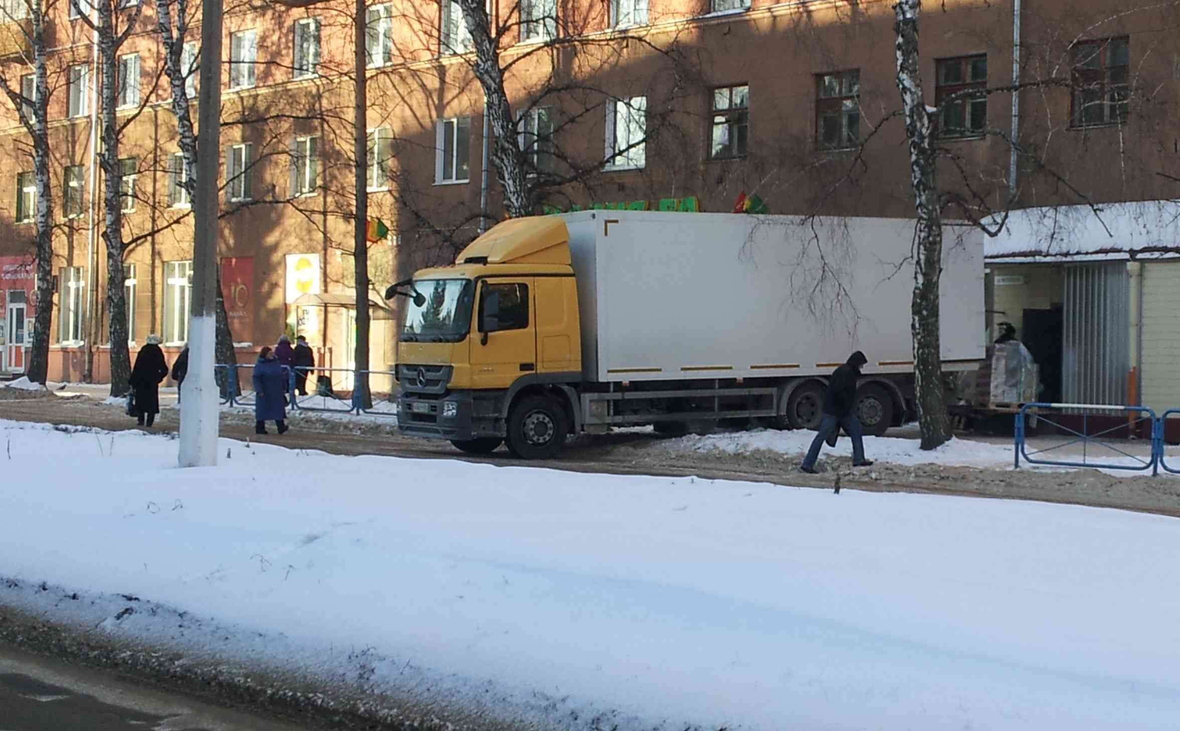 Перегородили огромным автомобилем половину проезжей части и весь тротуар, прохожие вынуждены обходить фуру по проезжей части. Кроме того демонтировано ограждение, испорчен газон, а весной когда земля оттает там вообще грязища будет не пройти.